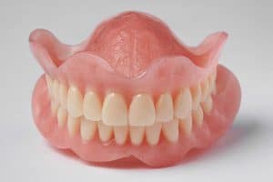 Full or complete dentures are entirely made of acrylic (pink plastic) and have acrylic teeth set up in them. They are used to replace missing teeth in the upper and lower jaws. They can be removable or fixed into the jaw bone with implants.
